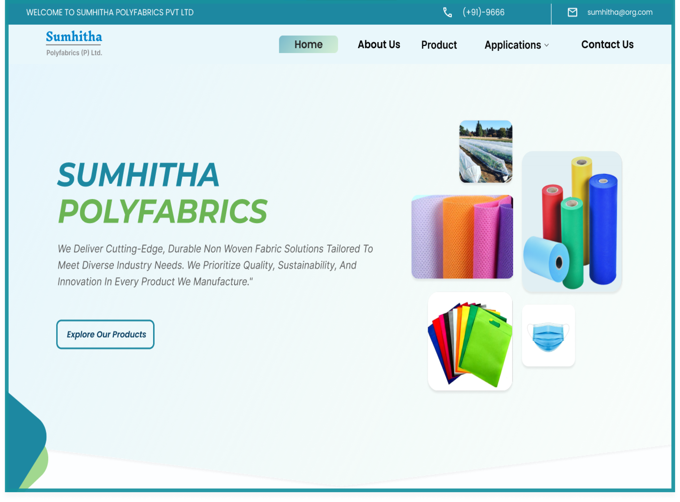 We developed Sumhitha Polyfabrics, a business website showcasing a wide range of polypropylene products for various industries. The site features detailed product listings, applications in sectors like agriculture, shopping bags, and furniture, and easy navigation for customers to explore and order.